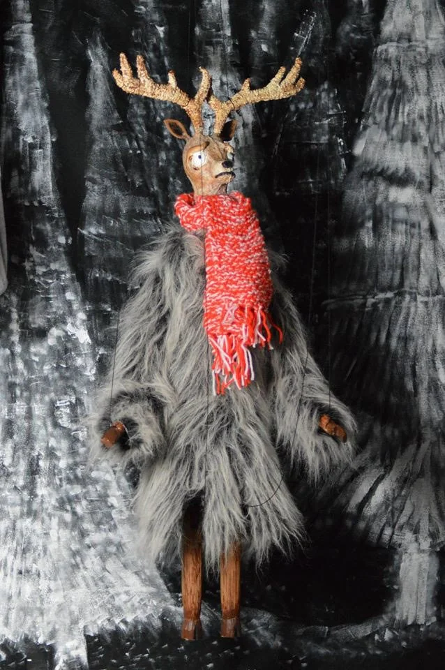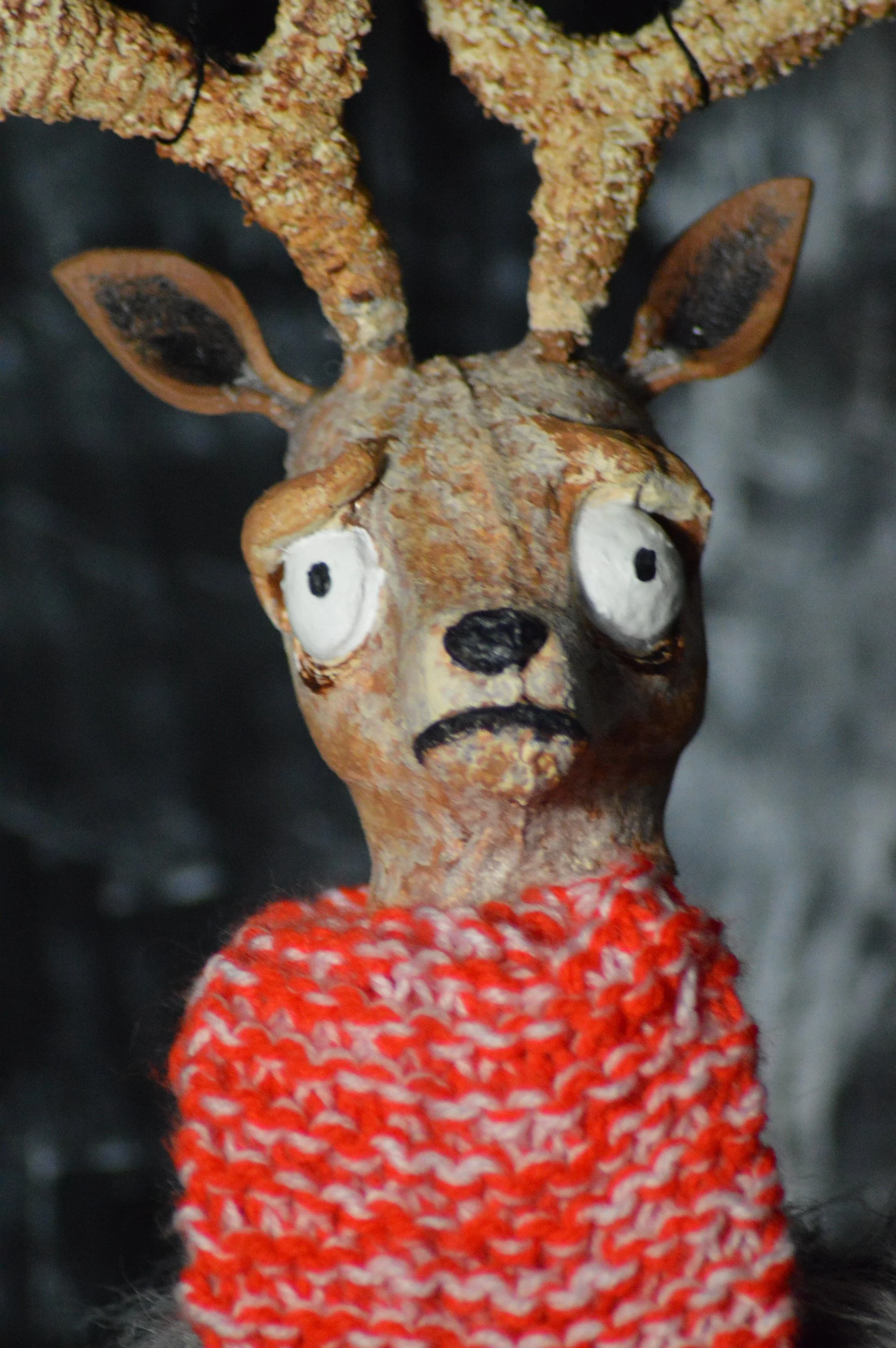 2016. Nightmare Before Christmas inspired 'Winter Spirit' marionette puppet. Head sculpted in clay and cast in latex, filled with expanding foam. Antlers formed in wire, wrapped in wadding and thread and dipped in latex. Limbs, carved from wooden dowels and jointed with metal pins. Body carved from foam. Approx 2.5 feet tall.