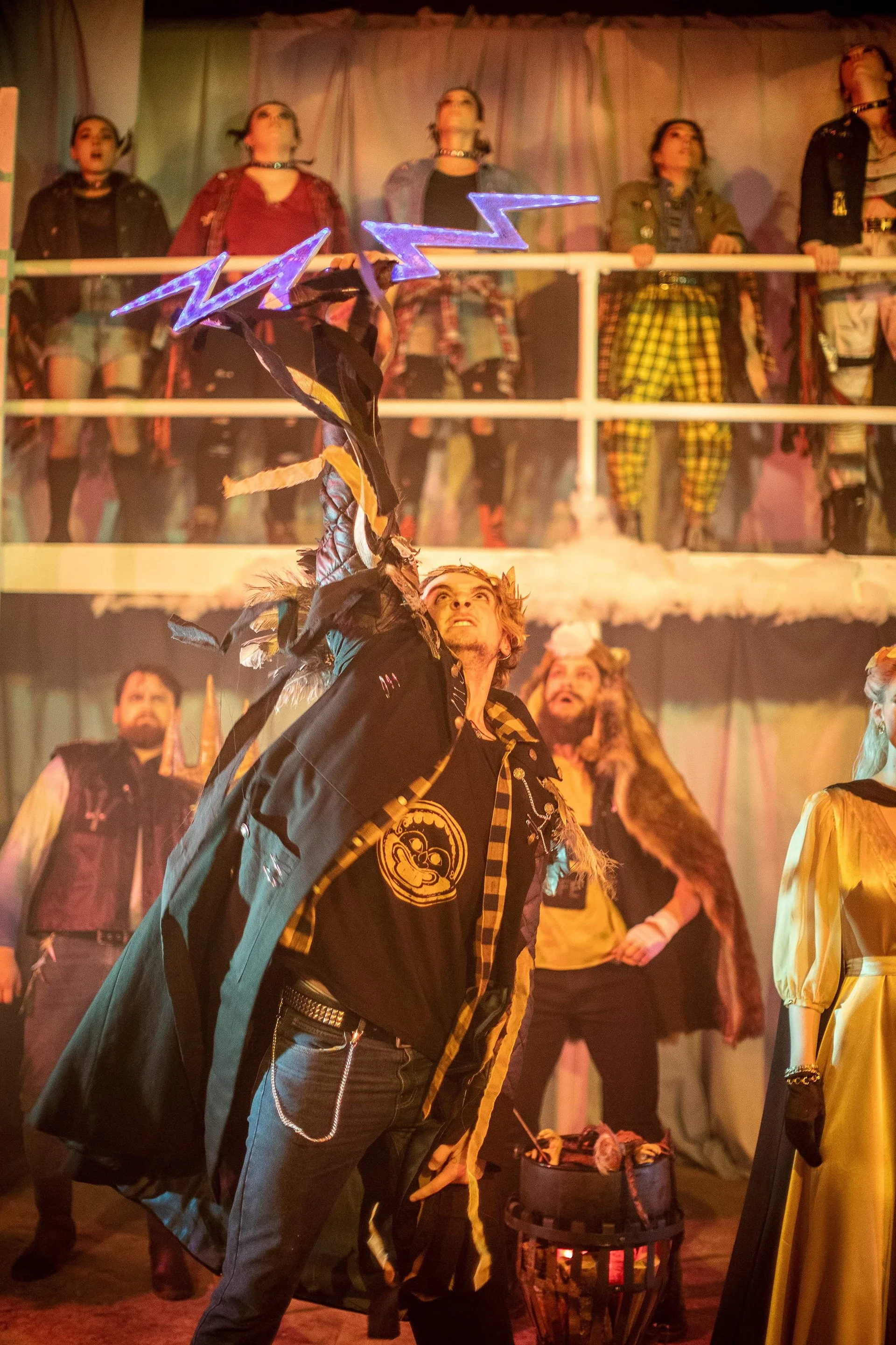 The Birds (Arts University Bournemouth Productions, 2019)- Illuminated Lightning Bolt. Laser cut clear acrylic sheets layered and edged with LED strip lights. Dir- Claire Camble. Costume Designer- Marcia Gomez. Set Designer- Erin Thomas.