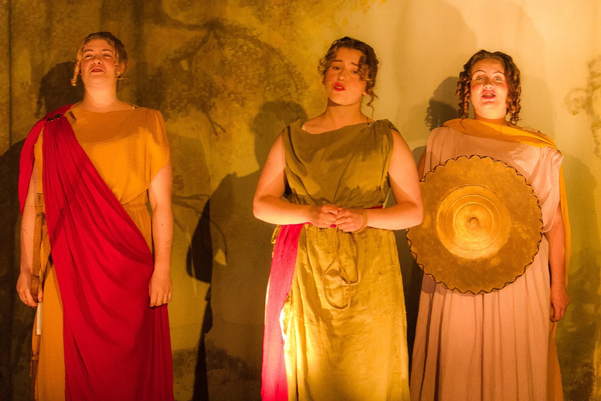 Playhouse Creatures (Arts University Bournemouth Productions, 2019)- Wooden Shield. Wooden disc with leather braiding around the edge and moulded leather relief detail. Dir- Sean Alta. Costume Designer- Shiner Kim. Set Designer- Sebastian Dominiguez.