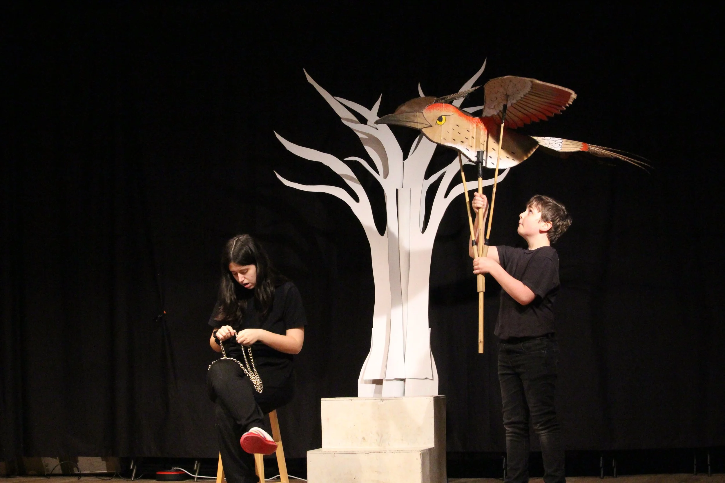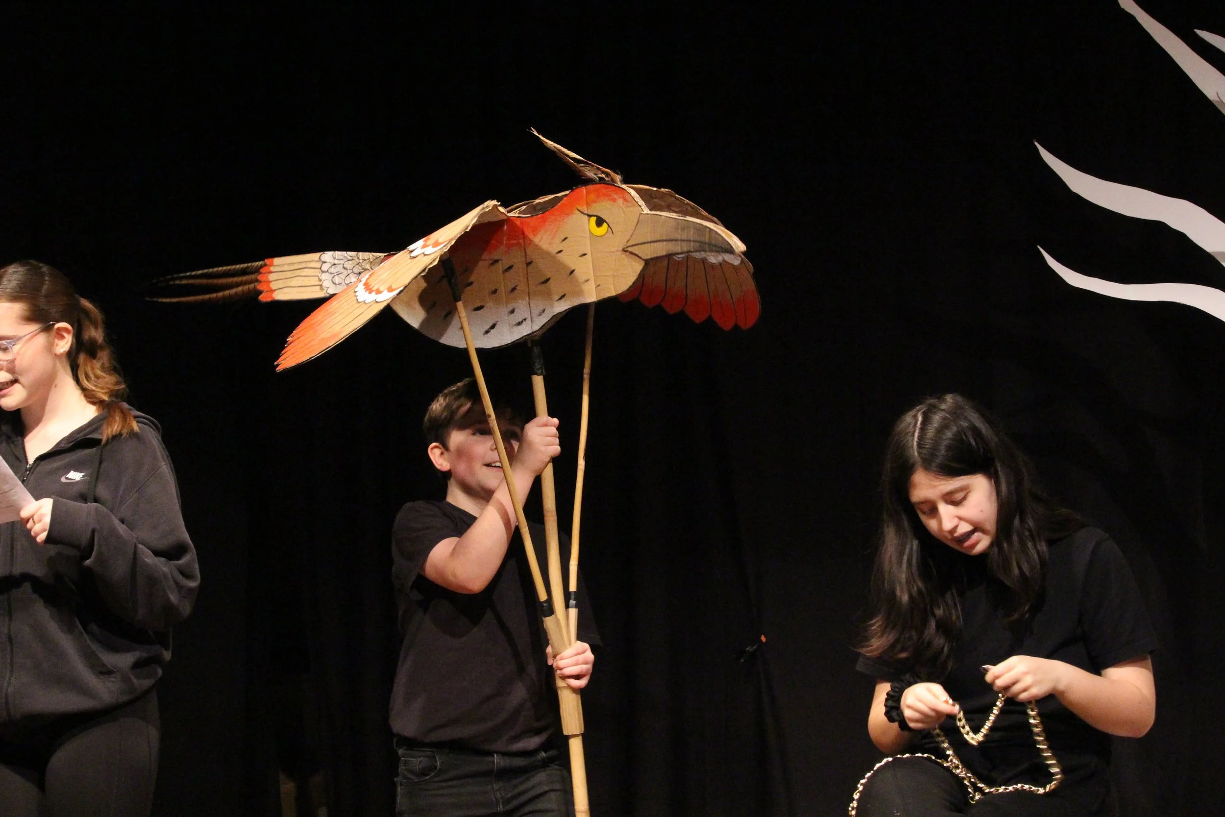 The Juniper Tree (Chippenham Youth Theatre, 2024)- The Bird. Cardboard bird puppet with flapping wings on bamboo canes.